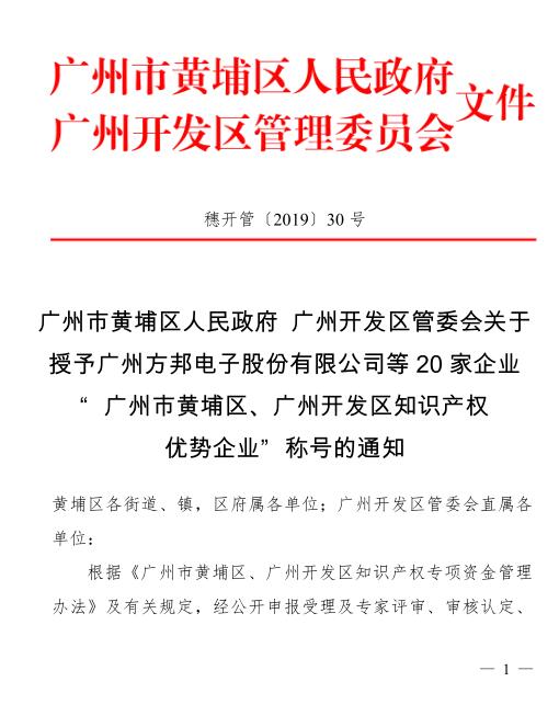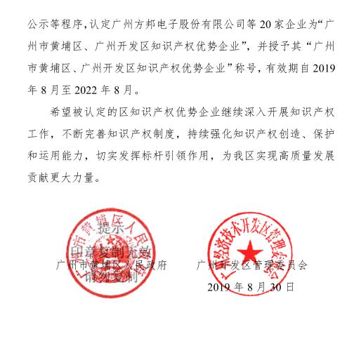 根据《广州市黄埔区、广州开发区知识产权专项资金管理办法》及有关规定,经公开申报受理及专家评审、审核认定、公示等程序,认定20家企业为“广州市黄埔区、广州开发区知识产权优势企业”,并授予 “广州市黄埔区、广州开发区知识产权优势企业”称号,有效期自2019年8月至2022年8月。