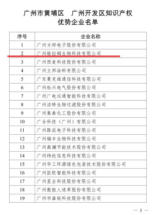 近日,广州市黄埔区人民政府 广州开发区管委会授予广州格拉姆生物科技有限公司等20家企业“广州市黄埔区、广州开发区知识产权优势企业”称号。