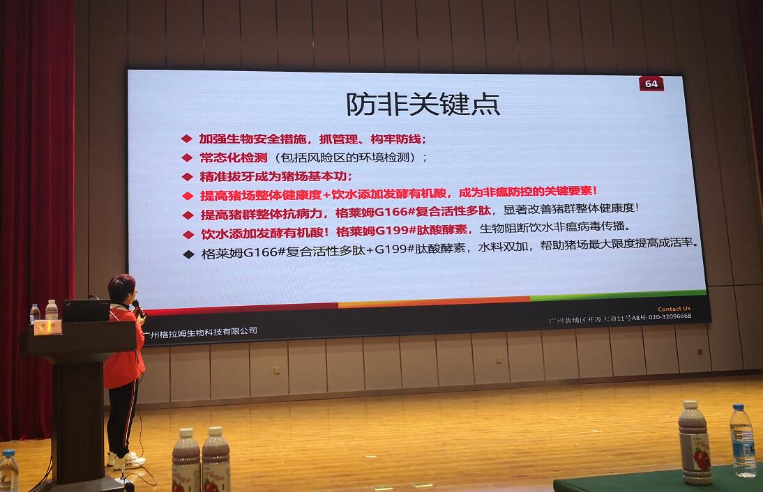广州格拉姆生物科技有限公司运营总监李莉应邀参席了会议,并就《发酵酸化剂的在防非和替抗中的应用》的课题为大家做了详细的研究报告。