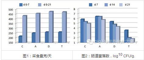 从图1和2可见不同种类的抗生素如何提高健康断奶仔猪的采食量,但它们对肠道微生物群有不同的作用(C为对照,A为阿莫西林,D为强力霉素,T为替米考星)。通过分子生物学技术可知不论使用何种抗菌剂,使用这些抗生素可降低细菌的多样性。